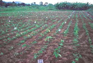 Besides the on-farm trial a series of experiments were conducted at the university station to investigate the effects of inorganic fertilisers and poultry litter on sweet potato and taro. The experiments ran for several seasons and yield, yield components and soil nutrient dynamics were investigated. Nutrient use efficiency (see below) and modelling of the nutrient uptake and allocation to various plant components (including roots – see below) were part of the research. Funding came from ACIAR and the University of Technology in Lae. Although the research was primarily on nutrient and yield dynamics, additional research focused on the incidence of nematodes and sweet potato weevils and the effects on crop production. Also the seasonal effects of rainfall was investigated and it was found that sweet potato yields were higher in seasons with lower rainfall.